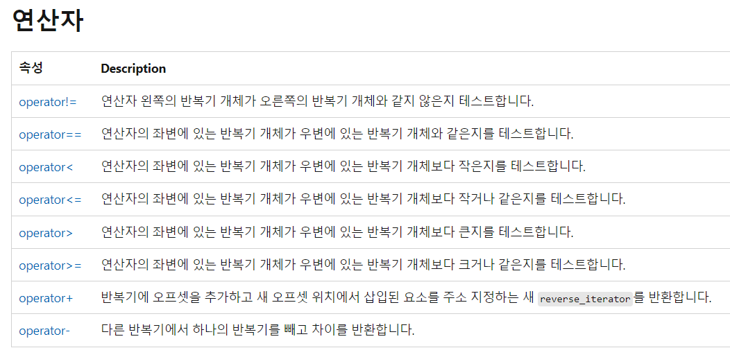 - 반복자 iterator : 단순연산을 지원한다 ( ++, -- 등)