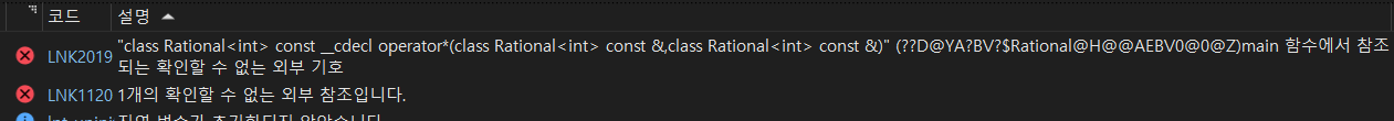 오류 LNK2019 "class Rational<int> const __cdecl operator*(class Rational<int> const &,class Rational<int> const &)" (??D@YA?BV?$Rational@H@@AEBV0@0@Z)main 함수에서 참조되는 확인할 수 없는 외부 기호 BookStudy C:\Users\ES58\source\repos\BookStudy\BookStudy\EffectiveC++46.obj 1함수 또는 변수가 선언되었지만 정의되지 않음 : 선언이 헤더 파일에 있지만 일치하는 정의가 구현되지 않은 경우 LNK2019가 발생할 수 있습니다.