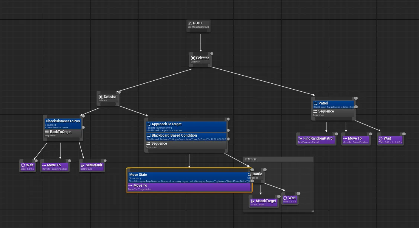 ์ ์ ๊ดด๋ฌผ์ด ๋๊ณ ์๋ค CheckDistanceToPosDecorator ๋ฅผ ์ถ๊ฐํด์ ์๋ ์์น์์ ๊ฑฐ๋ฆฌ๋ฅผ ๊ณ์ฐํด์ค๋คmove to ์ TrackMoveGoal ์ต์ ์ ์ผ์ฃผ์๋๋ฐ, ์ด๊ฒ ๋๋ฌธ์ ์บ๋ฆญํฐ์ ์ผ์ ์์ค ๊ฐ๊น์์ง์ง ์์ผ๋ฉด MoveTo๊ฐ ์ข ๋ฃ๋์ง ์์ ์์ ๊ณผ ๊ฑฐ๋ฆฌ๊ฐ ๋ฉ์ด์ก์์๋ ๊ณ์ ์ซ์์ค๋ ์ด์๊ฐ ์๋ค
